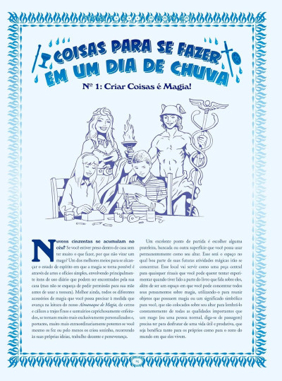 Seu conteúdo inclui ensaios instrucionais profusamente ilustrados sobre as teorias da magia desta antiga seita, notavelmente à dissertação-chave "Aventuras no Pensamento", que oferece conselhos confiáveis sobre como a entrada no mundo da magia pode ser alcançadarapidamente. Além disso, diversas páginas de tarefas chamadas "Coisas para se Fazer em um Dia de Chuva" apresentam atividades animadas e divertidas que podem ser feitas após o estado mágico ser alcançado, incluindo passatempos populares como adivinhação, viagens etéricas e a invocação de espíritos, divindades, mortos e entidades infernais, que certamente se tornarão seus novos melhores amigos.